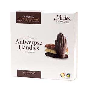 Dit vierkant doosje verstopt 24 momentjes van Antwerps chocoladegenot!